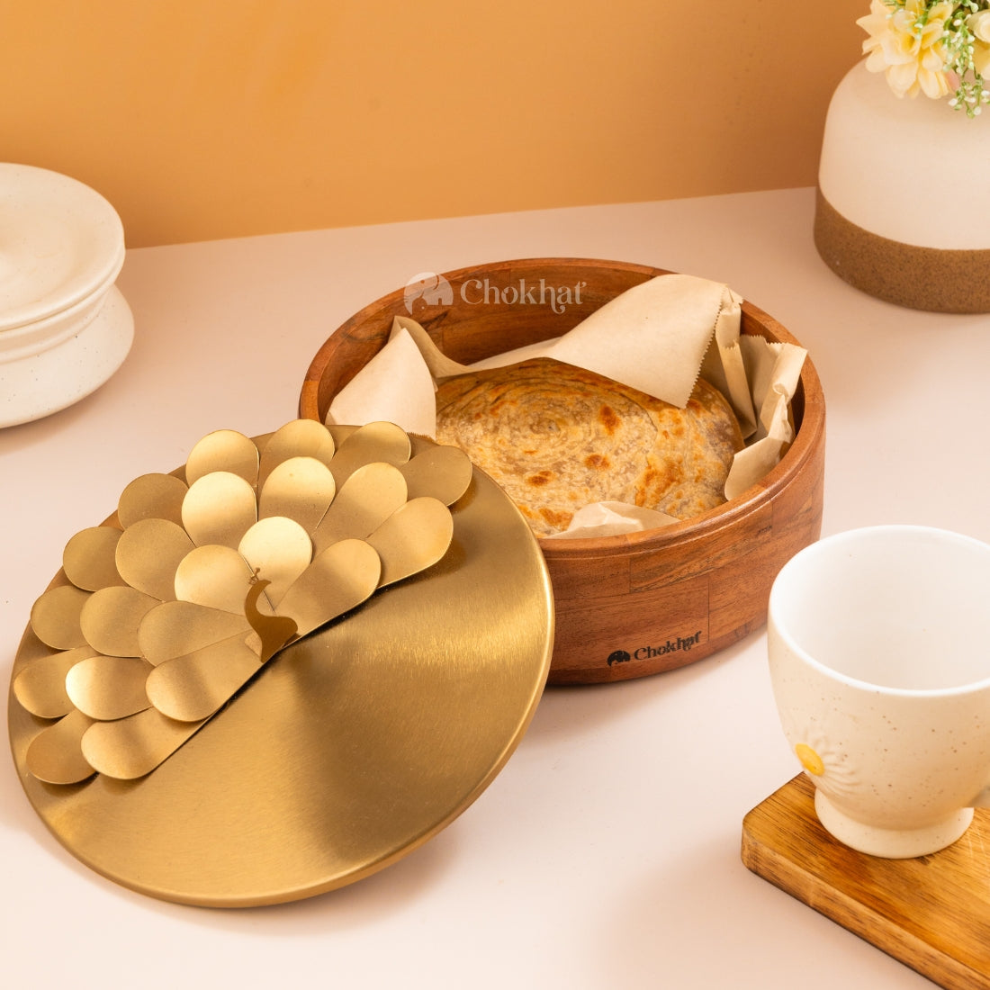 Showcase India's national bird at your table with our majestic Mor Roti Box. Expertly handcrafted from acacia wood with a regal peacock-adorned lid in gold-finished stainless steel. This stunning piece preserves the warmth and freshness of your rotis while celebrating traditional Indian artistry. A perfect blend of functionality and cultural heritage for your dining rituals.