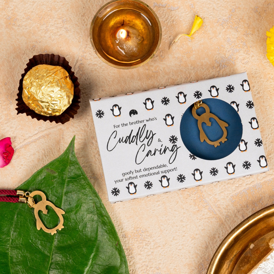 This Rakhi features an adorable penguin charm, celebrating the brother who's always by your side—comforting, goofy, and full of love. It’s crafted for the one who melts hearts with his care.