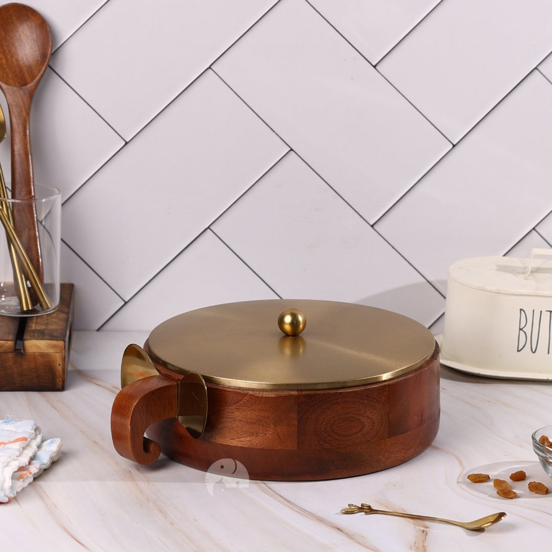 Elevate your dining experience with our Sahara Masala Box, featuring elegant golden ears that embrace warmth like a desert sunset. Meticulously handcrafted from sustainable acacia wood and adorned with a lustrous gold-finished stainless steel lid. This exquisite serving piece celebrates India's... See More